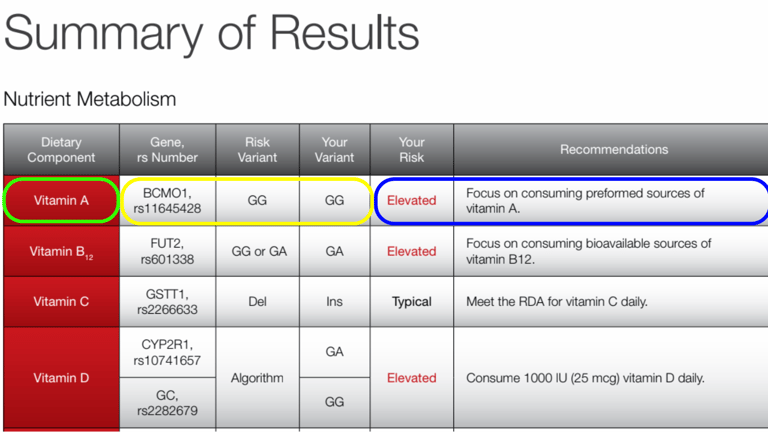 לפי ההמלצות בדוגמא, הגוף של הנבדק מעבד או סופג ויטמין A (בשורה הראשונה) בצורה פחות יעילה.